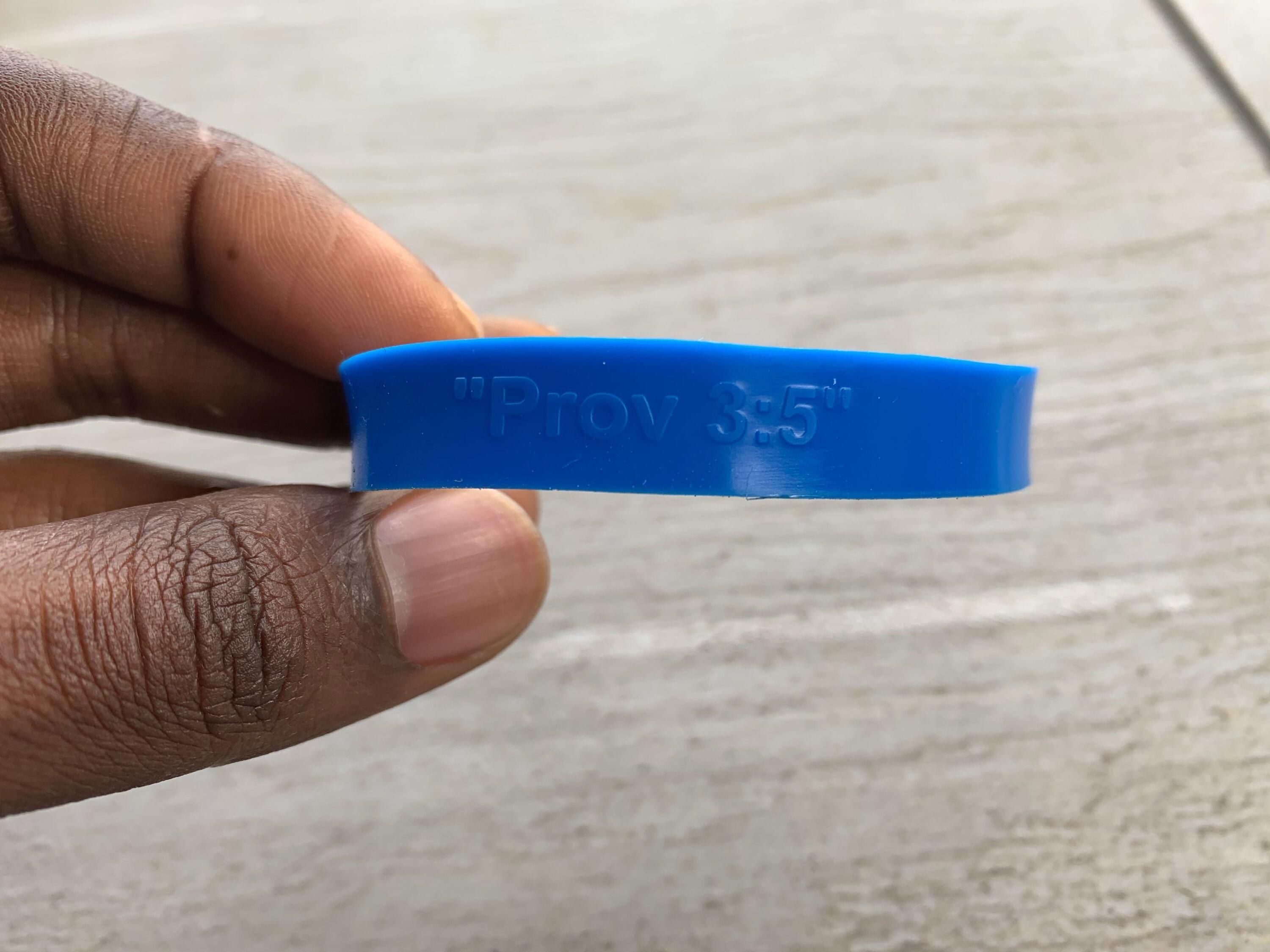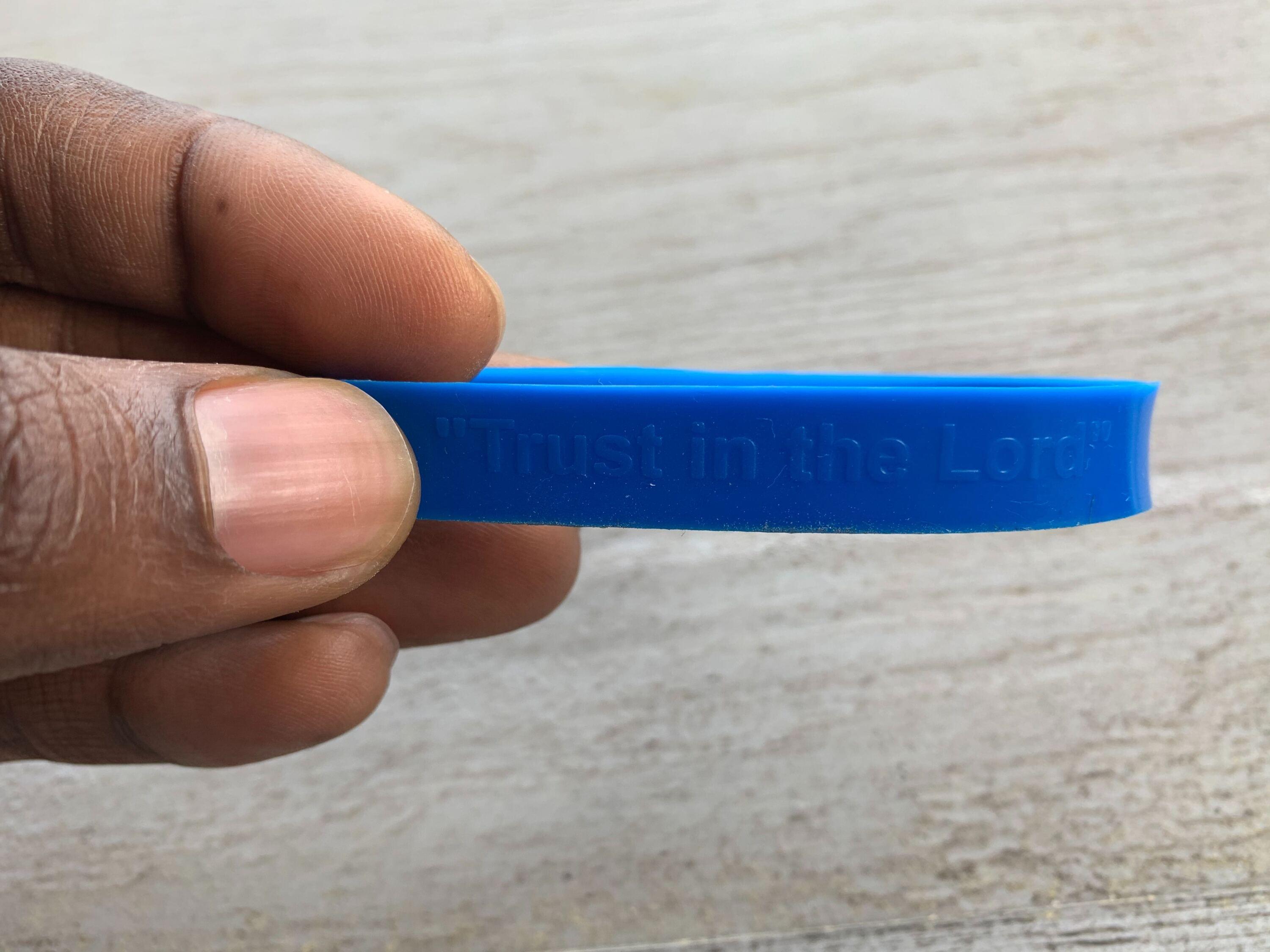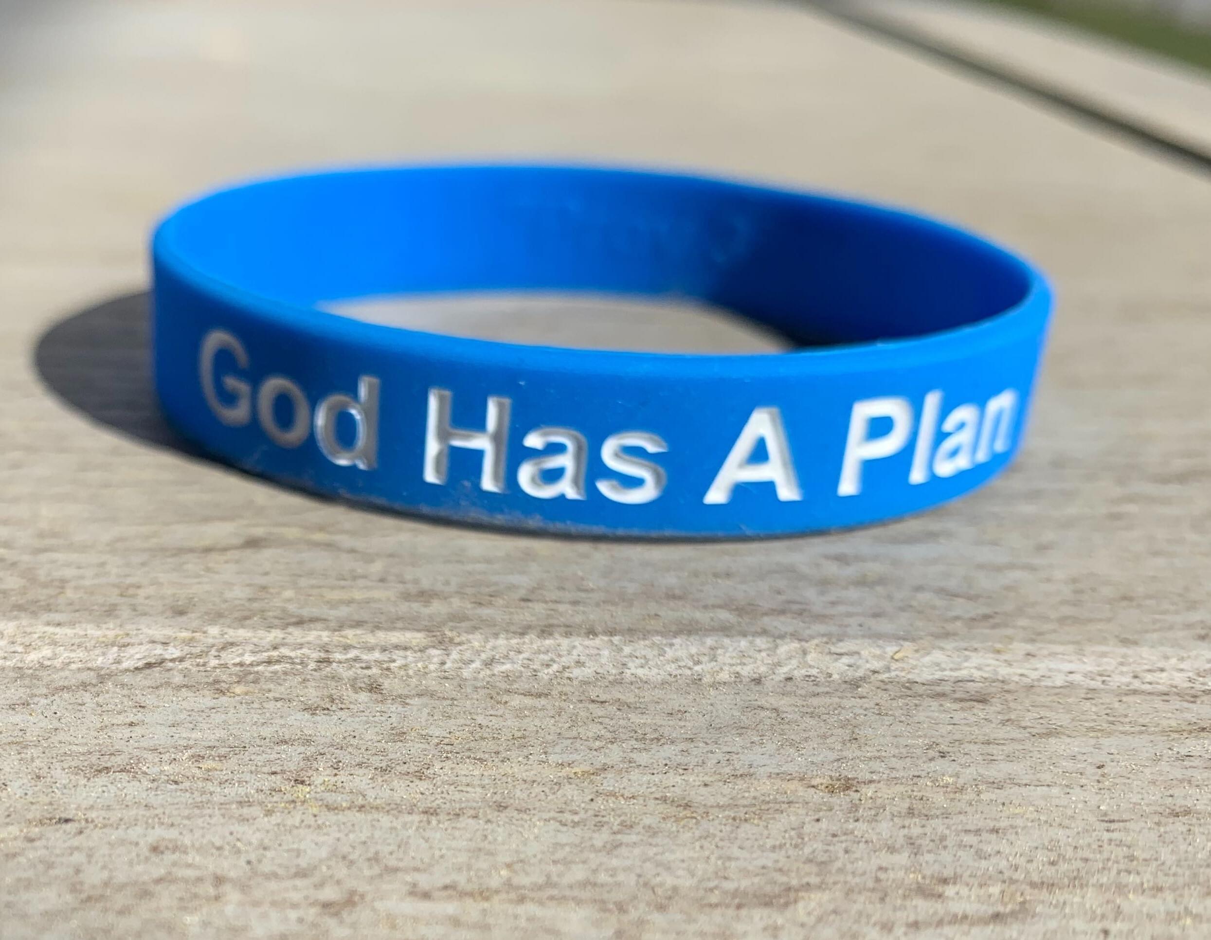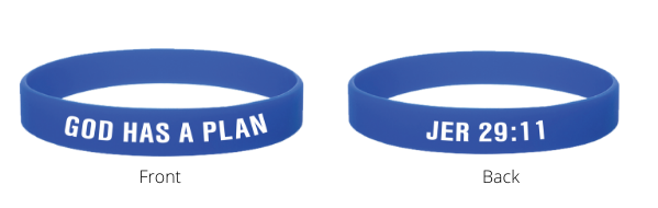 Written on the outside of this wristband is "GOD HAS A PLAN" and "Jer 29:11". Embossed on the inside of the wristband is “Trust in the Lord" and "Prov 3:5”